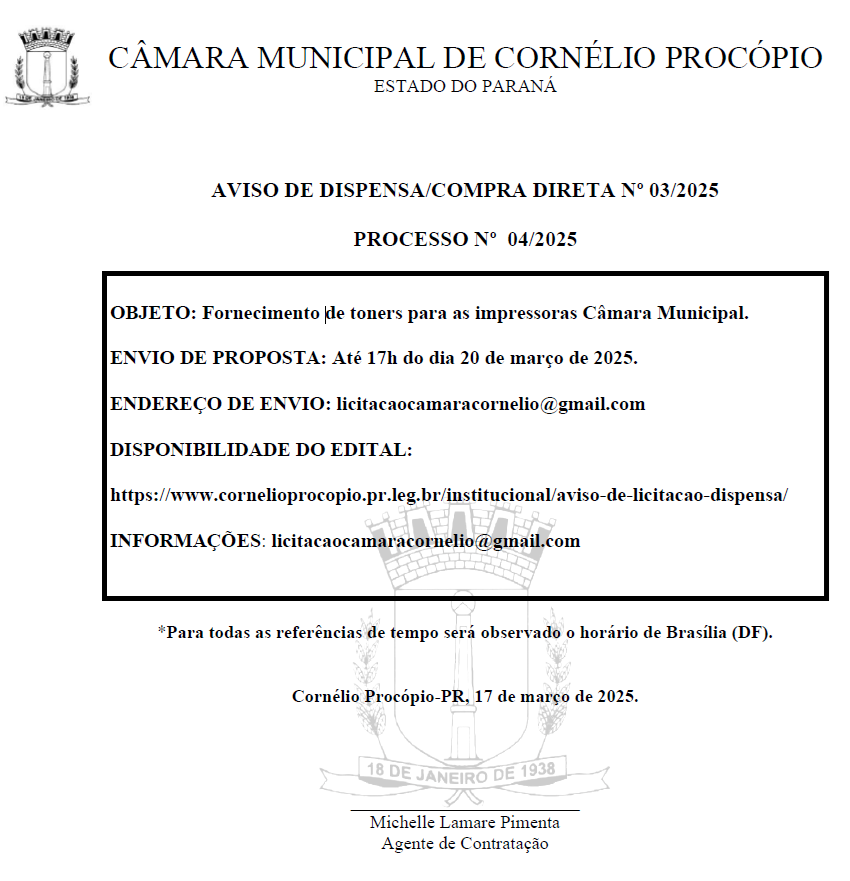 A presente COMPRA DIRETA ficará ABERTA POR UM PERÍODO DE 3 (TRÊS) DIAS ÚTEIS, a partir da data da divulgação no Sitio oficial da Câmara Municipal de Cornélio Procópio-PR https://www.cornelioprocopio.pr.leg.br/institucional/aviso-de-licitacao-dispensas, sendo que a proposta de preços e os respectivos documentos de habilitação deverão concomitantemente serem encaminhados ao e-mail: licitacaocamaracornelio@gmail.com.